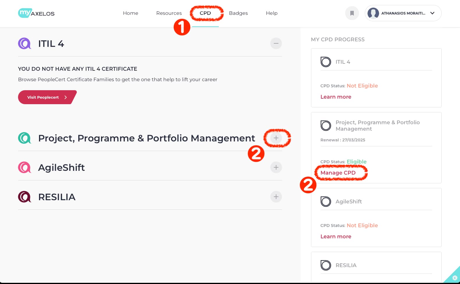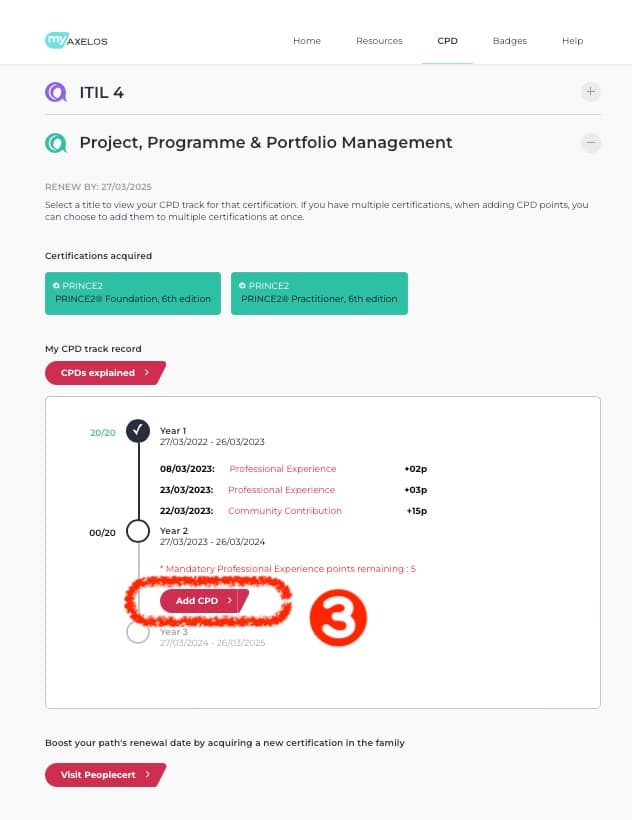 CPDを利用した専門スキルと知識のポイントによる更新方法は、MyAxelosのウェブサイトに記載がございます。