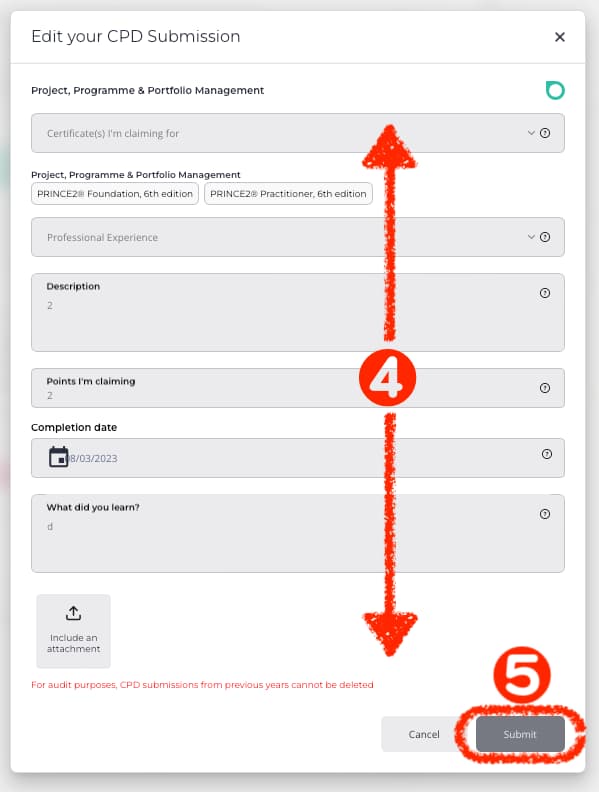 [Completion date] は、このCPDアクティビティを完了した日付です。CPDは遡及的に提出できますが、特定の認定年内に限られます。たとえば、最後の認定が4月1日に試験に合格した場合、CPD を提出できるのは、特定の年の4月1日まで遡ってのみです。各年3月31日以降は、前年のCPDを提出できなくなります。