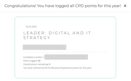 当該年度の更新に必要なすべてのCPDポイントの登録が修了するとパネルで、 ”Congratulations! You have logged all CPD points for this year!" と表示されます。